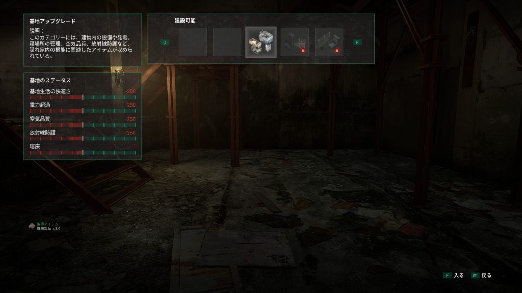 サバイバル難易度を下げればおそらく物資がたくさん手に入るので、管理難易度を上げても大丈夫だろうと思うのだが、本末転倒も良いところなので、難易度を弄るのは特に推奨しない。ミディアムで十分。探索の時間も手間もかかってしまうので、没入感が薄れる可能性もあるし。