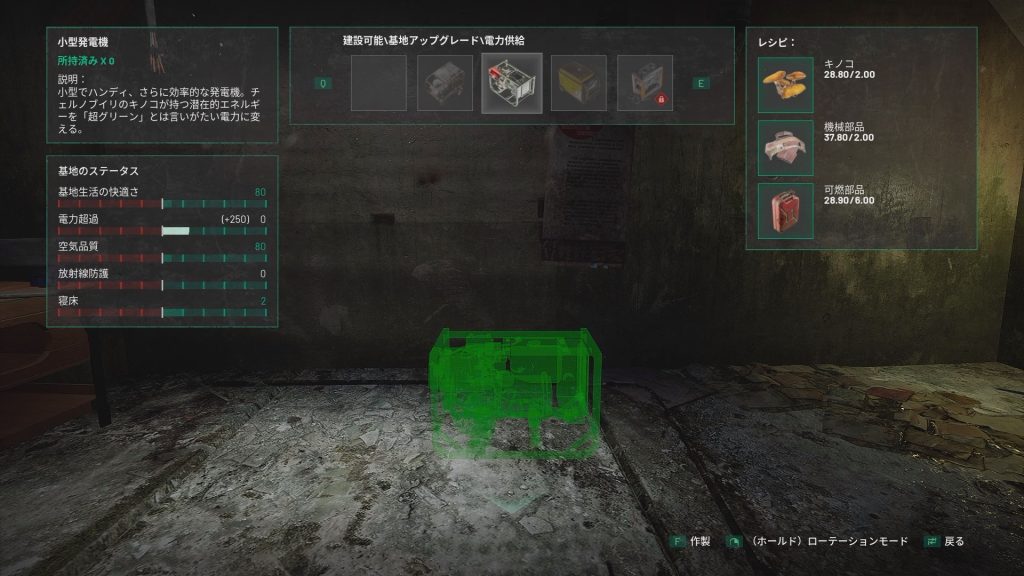 発電機を作るのに「キノコ・機械部品・可燃部品」というシンプルな用語が飛び交う。これは実際に採集しているときはそこまで違和感がないといえばないので、ゲーム的に割り切ったなあと納得はした。