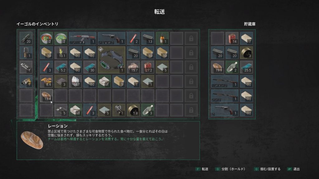 まずアイテム配置の問題についてだが、その場所に落ちていそうなものが落ちているという点がダイレクトに影響してくる。エリアによっては住宅などが少なく、それによりレーションが手に入りにくいという問題が生じる。サバイバル難易度ミディアムにおいては、仲間の仕事成功率も高く、余るほど手に入ってしまうのだが、難易度を上げるとたまにカツカツになってしまう。最高難易度だと分配できないレベルに。