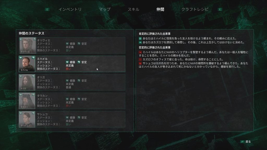 「原語ではなんて言ってるんだろう」と気になるくらいに丁寧に作られているのには正直驚く。それだけに、「AとBのどちらを選択してどちらの顔を立てるか」のたびに、選ばれなかった方から長文で罵られるのが結構堪える。拠点に戻った際に2回目の罵りもあったりするので、全体としてかなりの分量のロシア語での罵倒を聞くはめになる。そもそも選択肢がなんでこの2択なの?折衷案はないんですか?なので真剣に悩んだ結果そうなるというのは結構心に来る。