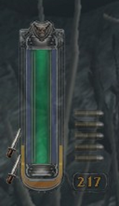 それ以前にこの小さい部分に全部突っ込むのはデザインという意味では欠陥としか言いようがない。ちなみに左の剣アイコンは「銃剣(投げて使う場合)の残り数」で深い意味はない。下の数字は今の武器の残弾数。ほかのデザインを無視してストレートに数字で書く割に、上の残弾インジケータは全体に対して何割という程度のざっくりとした書き方で統一感ゼロ。デザインの欠陥はずっとついて回るので文句が多くなるし、文句を言うときは饒舌になるもんだ。