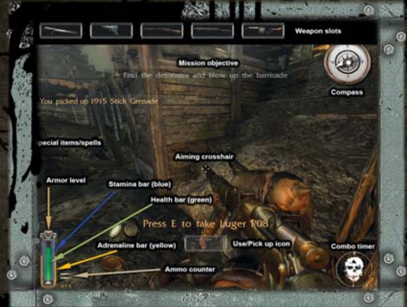 あんまり出てこないアーマーは上に乗るだけなので無視していい。体力ゲージはわかりやすいとしても、ゲームで大事な意味を持つアドレナリンゲージが周りの黄色い部分で、溜まっていないと視認性が悪すぎる。緑の左右のちょっと青っぽい部分、単なる空白かと思う部分がスタミナゲージで、ダッシュすると減る。ダッシュ可能時間がやたら短いのでスピーディなゲーム感をなくしているし、視認しづらいのでなんで遅くなった?みたいに戸惑いがち。ポーランド語?のマニュアルに書いてあるのだが「ダッシュしている間はプレイヤーの的が小さくなるので被弾率が減る」らしい。隠れているより突っ込んだ方が効果的かもしれないぜ!とも追加で書いてあるのだが、HPゲージも被弾しなければ60%まで回復するシステムになっている。なのでやたらめったら突っ込むのが正解なのか、ある程度抑えめにするのがベターなのか開発側の意図がつかめない。